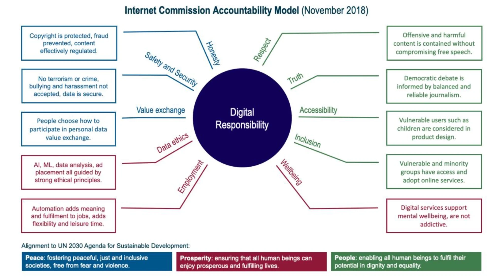 In October 2018, together with the Centre for European Policy Studies, the Internet Commission convened leading academics, EU policymakers and business leaders to discuss first ideas. The discussion was shaped and inspired by the UN Agenda for Sustainable Development and its vision of a better world. We have now created a version of the Internet Commission’s Accountability Model which maps Digital Responsibility issues to three key areas of the UN agenda: people, prosperity and peace.